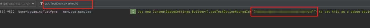 查看日志 找到类似Use new ConsentDebugSettings.Builder().addTestDeviceHashedId("ABCDEF012345")