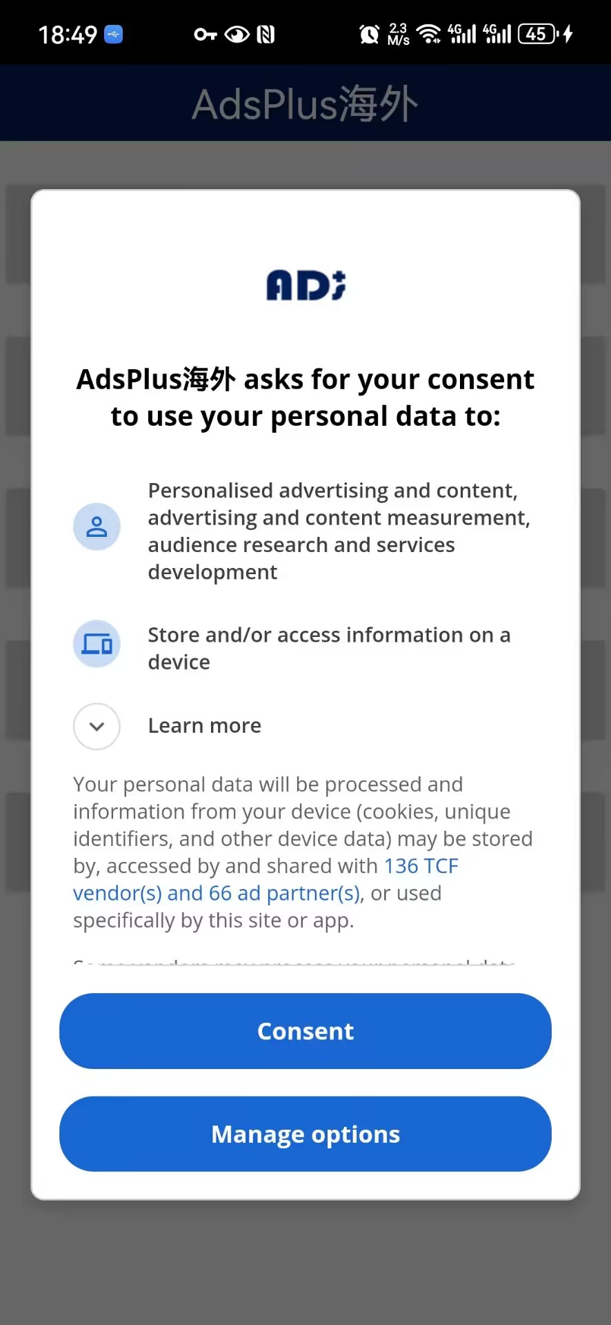 当用户是欧盟用户,并且没有选择过隐私授权表单,调用此方法会弹出以下表单界面,当用户选择同意或者拒绝之后,在13个月的有效期内此方法不会再弹出隐私授权表单。所以建议每次都调用此方法,当失效后又会弹出让用户自己选择。